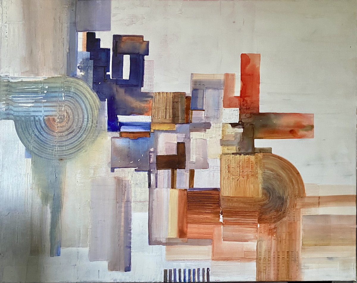 Des modules s’entrelacent comme les briques d’un édifice en perpétuel mouvement, leurs formes dansant sous des teintes vives — du bleu profond à l’orange éclatant — tandis que l’encre s’étire, se dissout, laissant des traces translucides qui respirent.